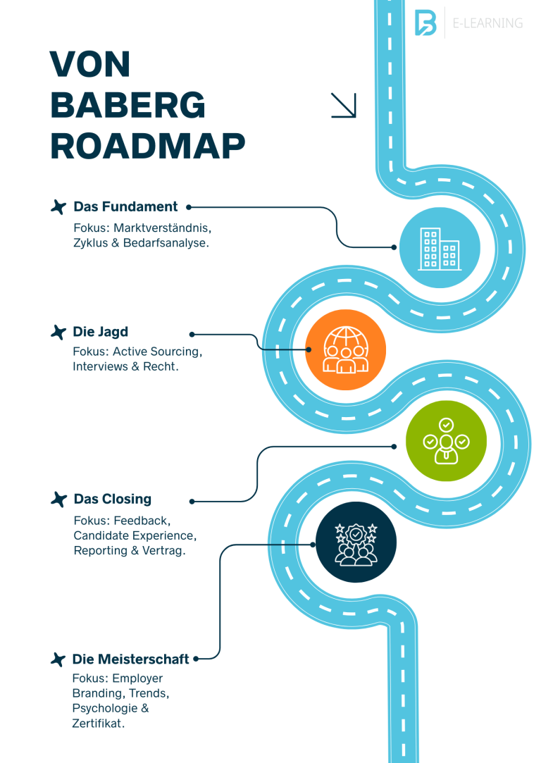In 20 aufeinander aufbauenden Modulen erlernt man Schritt für Schritt, wie modernes Recruiting heute funktioniert.